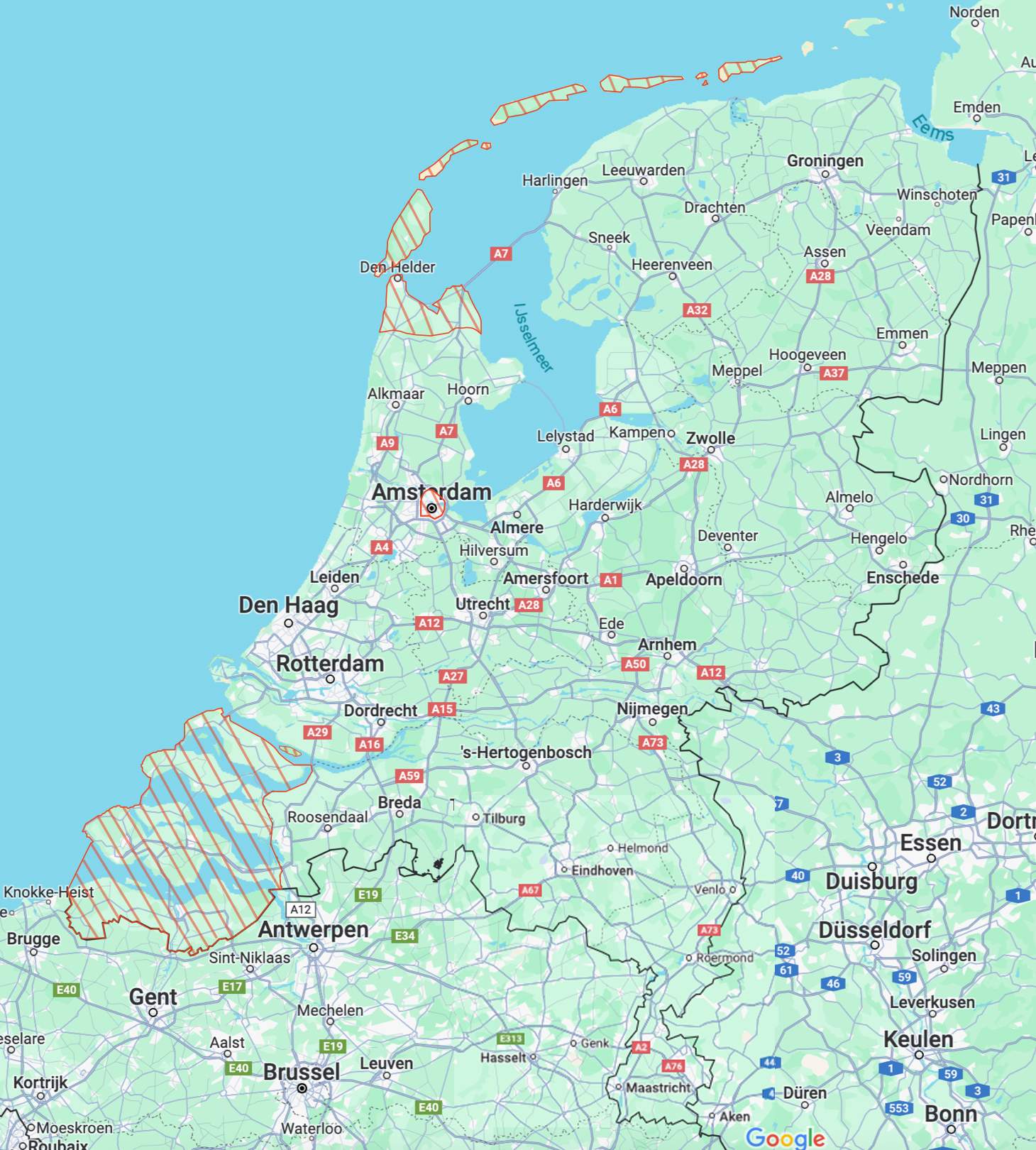 Met uitzondering van het gearceerde gebied en Belgiƫ.